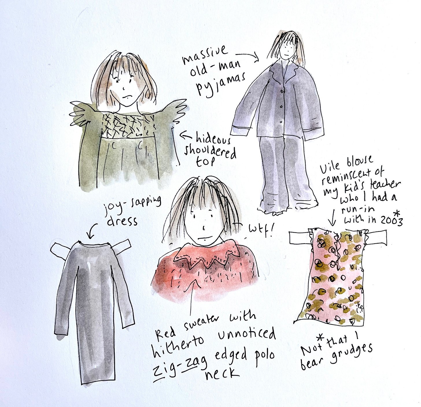 Alternatively, slosh down the sauvignon and we’re talking ill-considered purchases such as these, all made within the past few weeks. Eg, one seemingly inoffensive red sweater with hitherto unnoticed ZIG-ZAG EDGING on polo neck!